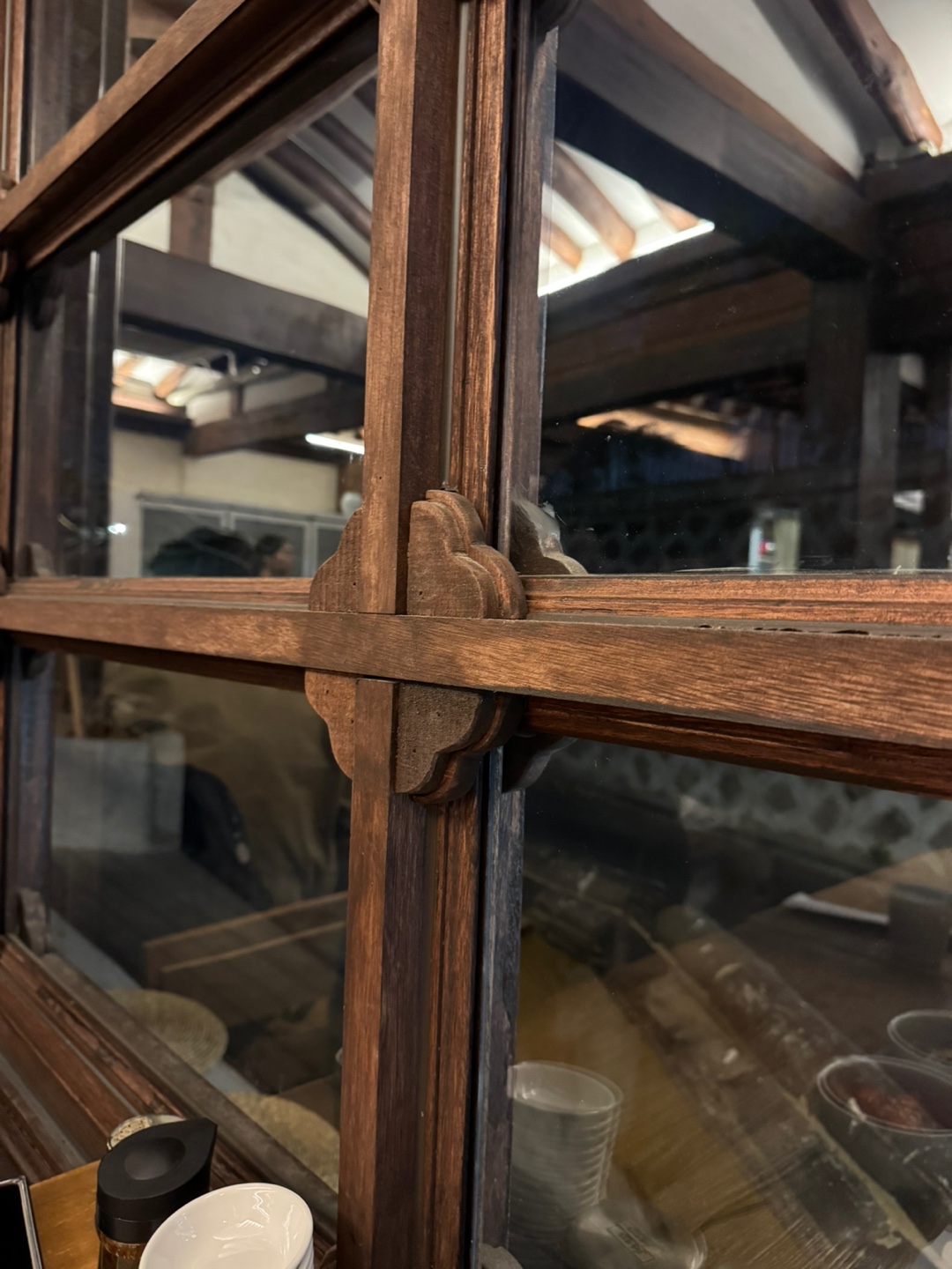 문을 열고 들어가니 서까래가 보이는 한옥 인테리어에